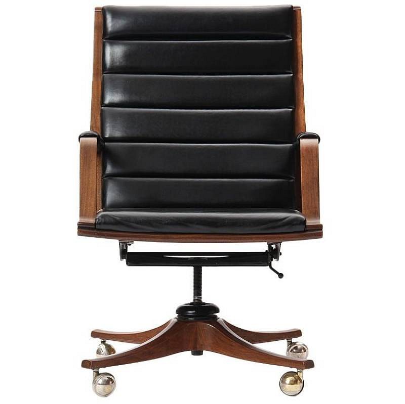 a bent laminate walnut desk chair with original black channeled leather on casters, 24 x 27 x 30 in. (61 x 68.6 x 76.2 cm)