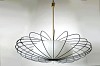 pair of chandeliers consisting of an acid etched glass shade, ovoid in shape, encompassed by numerous elliptical rods of enameled black brass, suspended from a central rod and canopy of polished brass